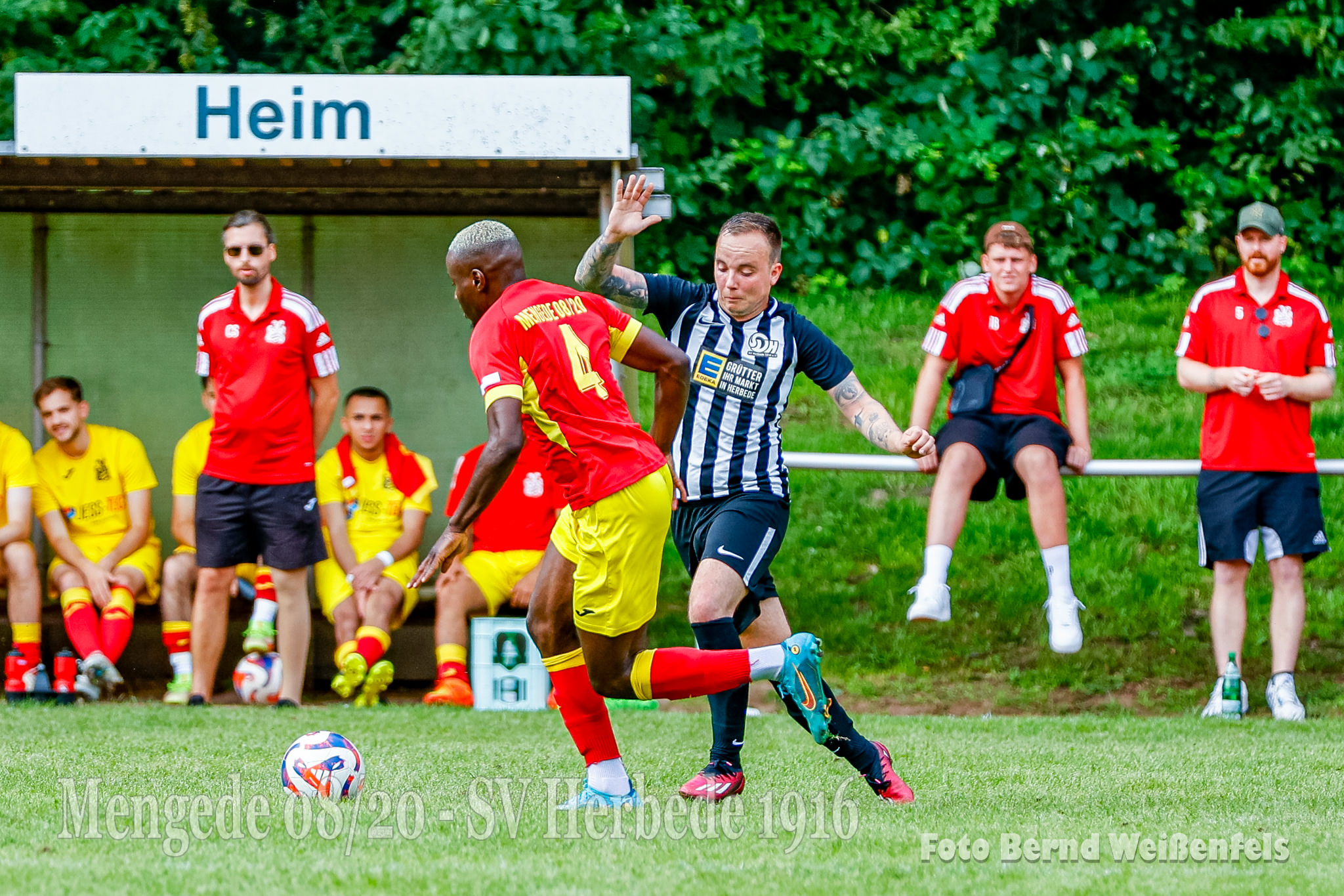 Saison 23/24, Bezirksliga Staffel 10.- 1. Spieltag und wir empfangen im Volksgarten die Elf von SV Herbede. Genug mit der Vorbereitung, heute galt es möglichst fit auf den Punkt zu sein. Unser Trainerteam geht mit einem stark verjüngten Kader in die neue Saison. Am heutigen Tag ist der Kader ziemlich komplett, es fehlen aktuell noch Yazan Alabar, Ritchie Kuck, Ozan Bektas (Urlaub) sowie die leider noch verletzten Fabian Ostermann und Rocco Dieckmann. Auch der frisch vermählte Mattes Schmidt war heute mit an Bord, trotz seiner Hochzeit letzten Freitag liess er es sich nicht nehmen, und um es vorweg zu nehmen, er lieferte eine starke Partie ab. Auch wollen wir nachträglich unseren Coach Christoph Schulz und seiner Ehefrau Gratulieren. Alles Gute für Ihre gemeinsame Zukunft!! Auf gehts, Anpfiff des Spiels! Die erste gute Torchance gab es in Spielminute 12. als Massimo Weil nach einer schönen Aktion aus halblinker Position aus 20 Meter zum Abschluss kommt, leider klatscht sein Schuss nur gegen den Pfosten, und auch den Abpraller konnte Lucas K. (Kiki) nicht im Tor unterbringen, er war vermutlich auch etwas überrascht und traf die Pocke nicht optimal und so ging der Nachschuss übers Tor.