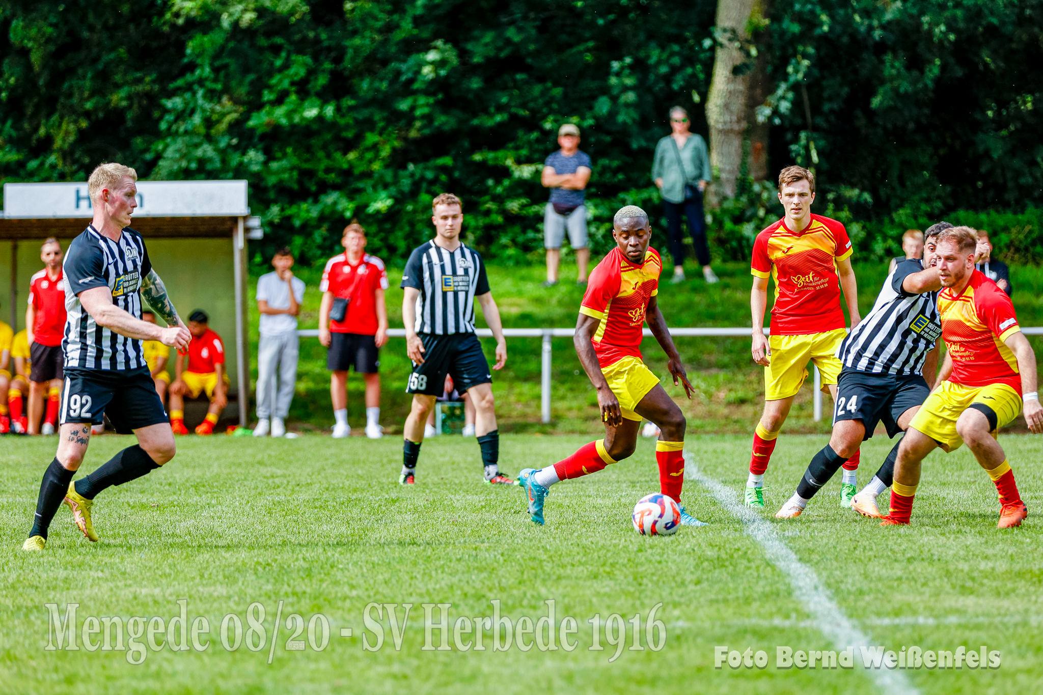 Saison 23/24, Bezirksliga Staffel 10.- 1. Spieltag und wir empfangen im Volksgarten die Elf von SV Herbede. Genug mit der Vorbereitung, heute galt es möglichst fit auf den Punkt zu sein. Unser Trainerteam geht mit einem stark verjüngten Kader in die neue Saison. Am heutigen Tag ist der Kader ziemlich komplett, es fehlen aktuell noch Yazan Alabar, Ritchie Kuck, Ozan Bektas (Urlaub) sowie die leider noch verletzten Fabian Ostermann und Rocco Dieckmann. Auch der frisch vermählte Mattes Schmidt war heute mit an Bord, trotz seiner Hochzeit letzten Freitag liess er es sich nicht nehmen, und um es vorweg zu nehmen, er lieferte eine starke Partie ab. Auch wollen wir nachträglich unseren Coach Christoph Schulz und seiner Ehefrau Gratulieren. Alles Gute für Ihre gemeinsame Zukunft!! Auf gehts, Anpfiff des Spiels! Die erste gute Torchance gab es in Spielminute 12. als Massimo Weil nach einer schönen Aktion aus halblinker Position aus 20 Meter zum Abschluss kommt, leider klatscht sein Schuss nur gegen den Pfosten, und auch den Abpraller konnte Lucas K. (Kiki) nicht im Tor unterbringen, er war vermutlich auch etwas überrascht und traf die Pocke nicht optimal und so ging der Nachschuss übers Tor.